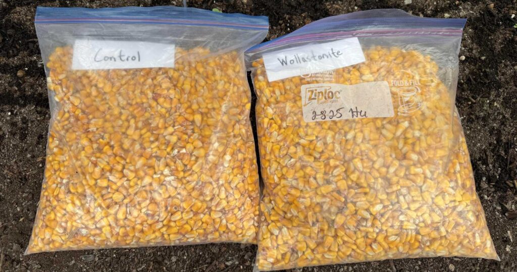 During the 2024 growing season, one of our Ontario farm partners, Mike and Tessa Dwyre, applied wollastonite to a portion of their field. An adjacent field, treated identically but without wollastonite, provided a useful comparison. By harvest, the visual and grading differences between the two were clear. The wollastonite-treated corn showed fuller kernel development and stronger test weights.